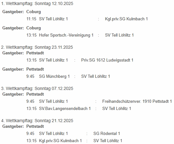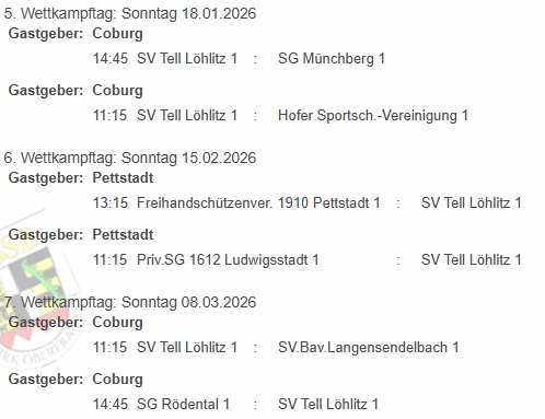 | 26.02.2023 14:45 | Kgl.priv. Gilde Kulmbach 1 | – | SV Tell Löhlitz 1 | 3 : 2 | PET |