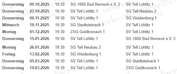 Do. 28.09.2023 19:30 | SV Tell Löhlitz 1 | – | SG Bad Berneck 2 |
