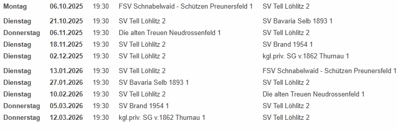 Di. | 14.11.2023 | 19:30 | SV Tell Löhlitz 2 | – | SG Stadtsteinach 1 |
