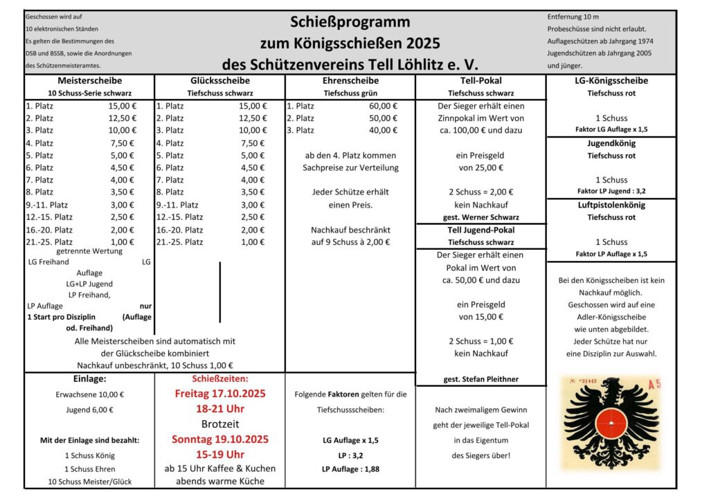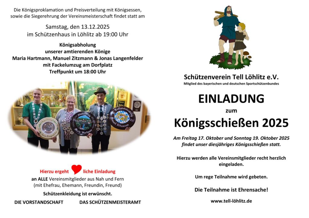 Das diesjährige Königsschießen findet am 17. und 19 .Oktober 2025 im Schützenhaus in Löhlitz statt. Hierzu ergeht herzlichste Einladung an alle Mitglieder des Vereins.