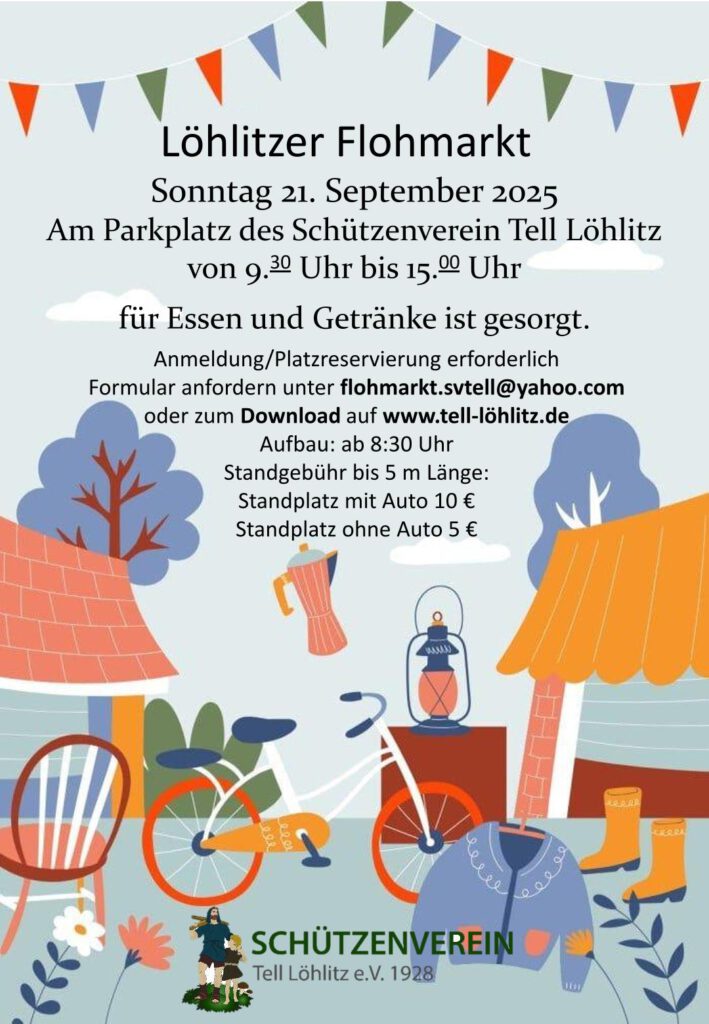 Flohmarkt am Sonntag 21.09.2025 Von | 6. September 2025 0 Kommentare Am 21.September findet am Schützenhaus in Löhlitz ein Flohmarkt statt. Anmeldeformular_Flohmarkt_Löhlitz1