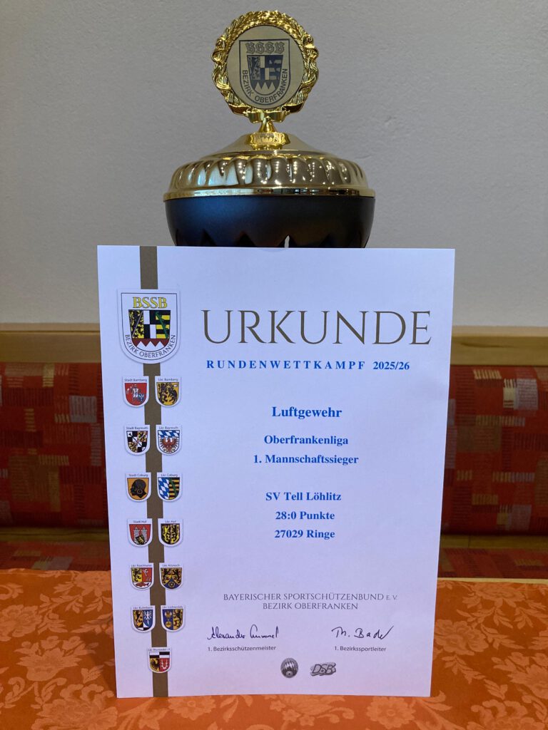 Mit einer beeindruckenden Saisonleistung hat sich der SV Tell Löhlitz e. V. den Meistertitel in der Luftgewehr-Oberfrankenliga gesichert. Die Mannschaft blieb über die gesamte Runde hinweg ungeschlagen und beendete die Saison mit makellosen 28:0 Mannschaftspunkten sowie einem hervorragenden Einzelergebnis von 60:10 Punkten.